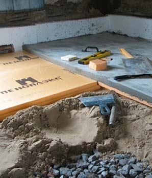 - В случае, если нужно выровнять пол в помещениях без отопления, например подвалы и склады, лучше выполнить черновой пол с теплоизоляцией. При таком способе предварительно выполняется монтаж теплоизоляционного слоя, а потом заливается раствор.
